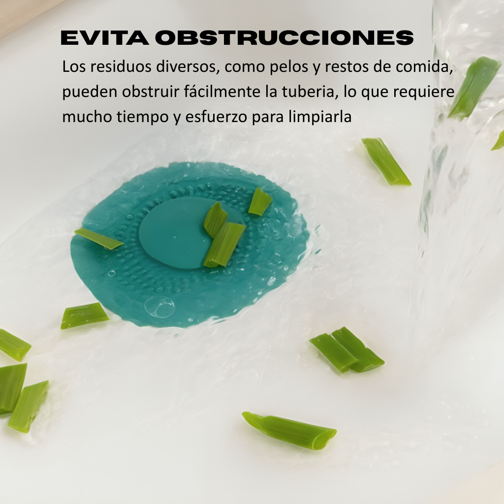 Este colador de silicona puede usarse en fregaderos, duchas, bañeras o lavabos. Colócalo fácilmente y se queda firme, mientras retiene todos los cabellos y restos, evitando obstrucciones y molestias.
